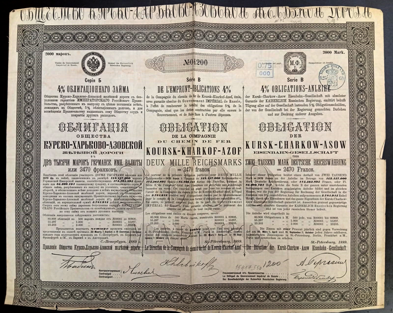 1. Облигация №04200 Общества Курско-Харьковско-Азовской железной дороги. в 2000 марок 1889 г.
