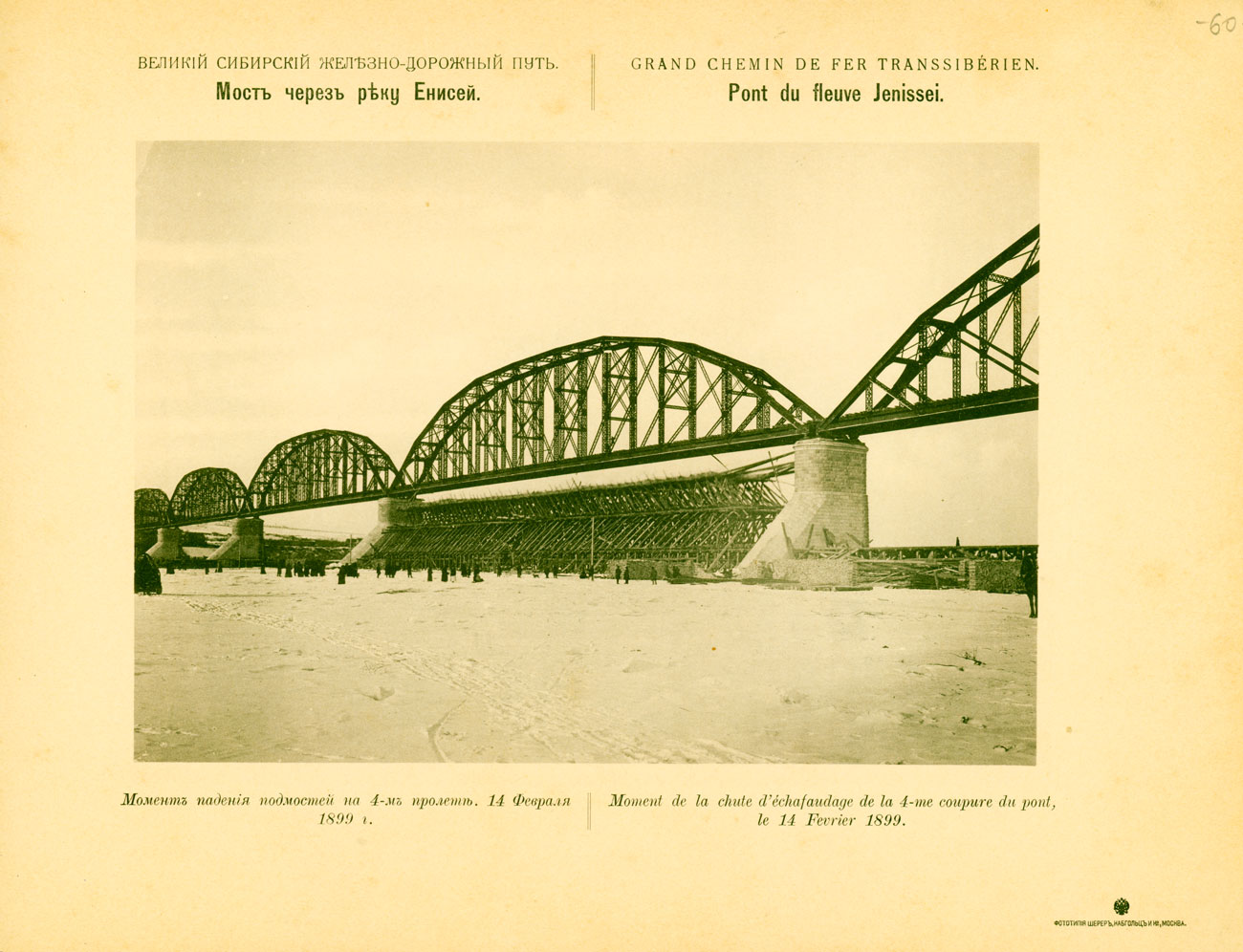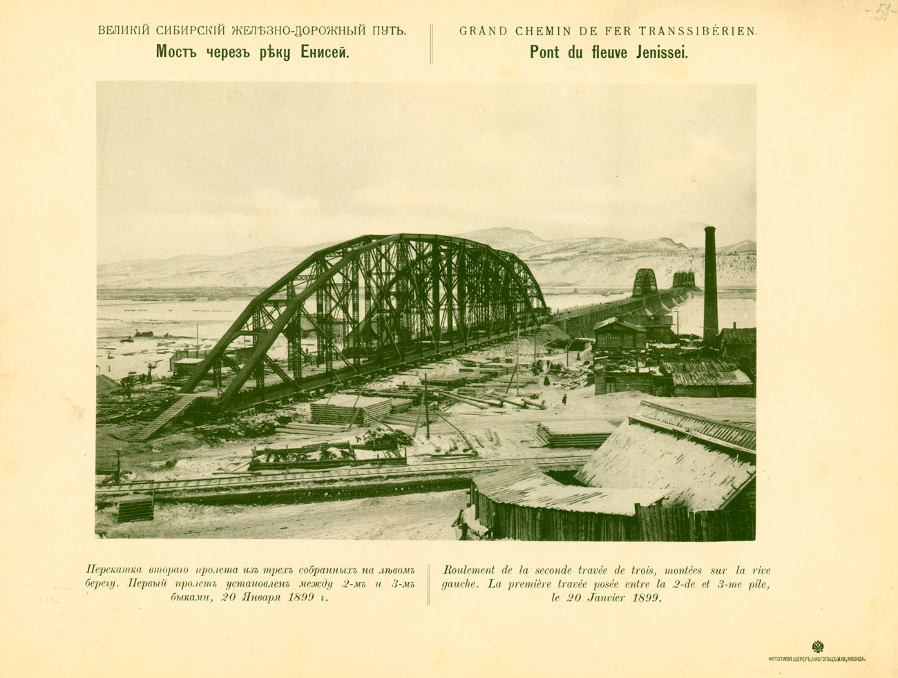 Подрядчиком на строительстве моста был выпускник Берлинской ремесленной школы и Цюрихского политехникума инженер-механик Евгений Карлович Кнорре. Во время проведения работ он фотофиксировал все этапы стройки. Эти фотографии и были опубликованы в альбомах фототипий «Виды работъ мостовыхъ сооруженiй на Средне-Сибирской желѣзной дорогѣ. 1894-1899. Инженеръ-Механикъ Е. К. Кнорре» (63 фототипии) и «Construction des Ponts du Chemin de Fer Transsibèrien. Travaux Exécutés par l`ing Knorré (Сооружение мостов на Транссибирской магистрали. Работы выполнены инж. Кнорре)» (83 фототипии). Высокое мастерство исполнения фотоизображений позволяет не только детально изучить технические особенности строительства одного из удивительнейших инженерных сооружений XIX века, но и восхититься зрелищностью представленной поэтапной «фотохроники».