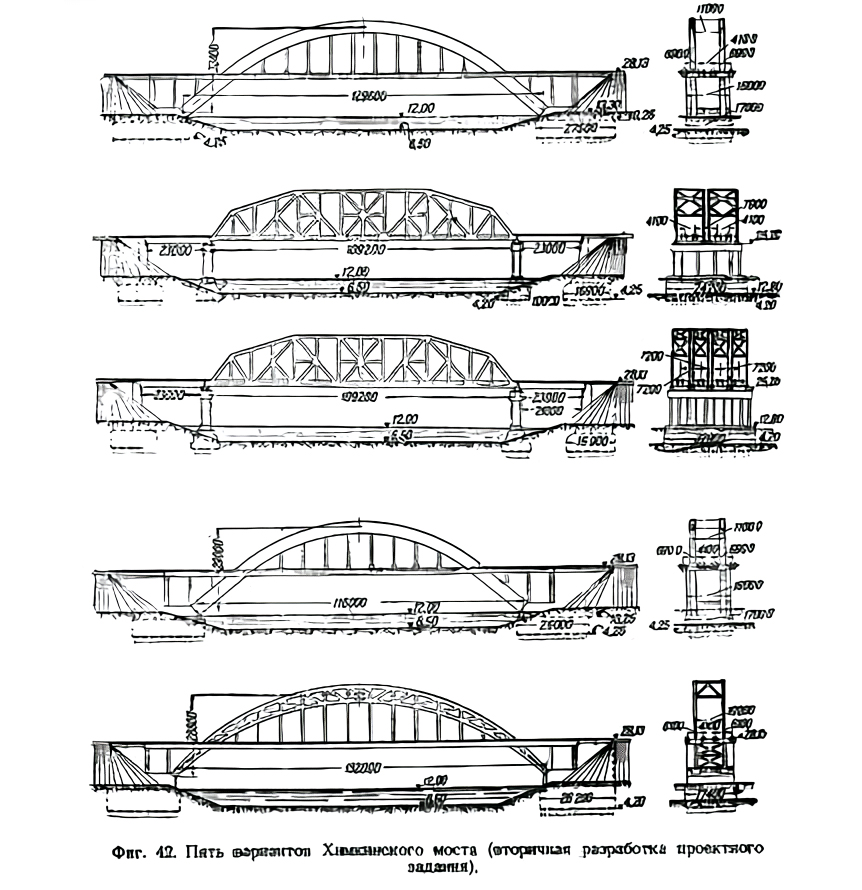 Все проекты можно разделить на три группы: железные переправы с балочными пролетами; железные мосты с арочными пролетами для четырех путей; железобетонные мосты с арочными пролетами для четырех путей. Третий вариант оказался наиболее практичным с точки зрения стоимости и времени строительства, так как возведение моста под четыре пути не сказывается на цене работ, а использование железобетона вместо железа будет даже дешевле на 30-35%.