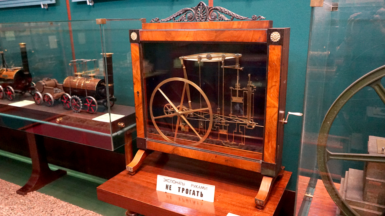 В фондах нашего музея зафиксирован в документах факт передачи в 1831 году вв модели паровой машины Джеймса Уатта в Институт корпуса инженеров путей сообщения. Мы предполагаем, что речь идёт о кинематической схеме, ныне представленной в одном из залов. В книге учёта фондов музея 1939 года она описана так: «Это была объёмная металлическая модель действующей паровой машины Уатта в стеклянном футляре».