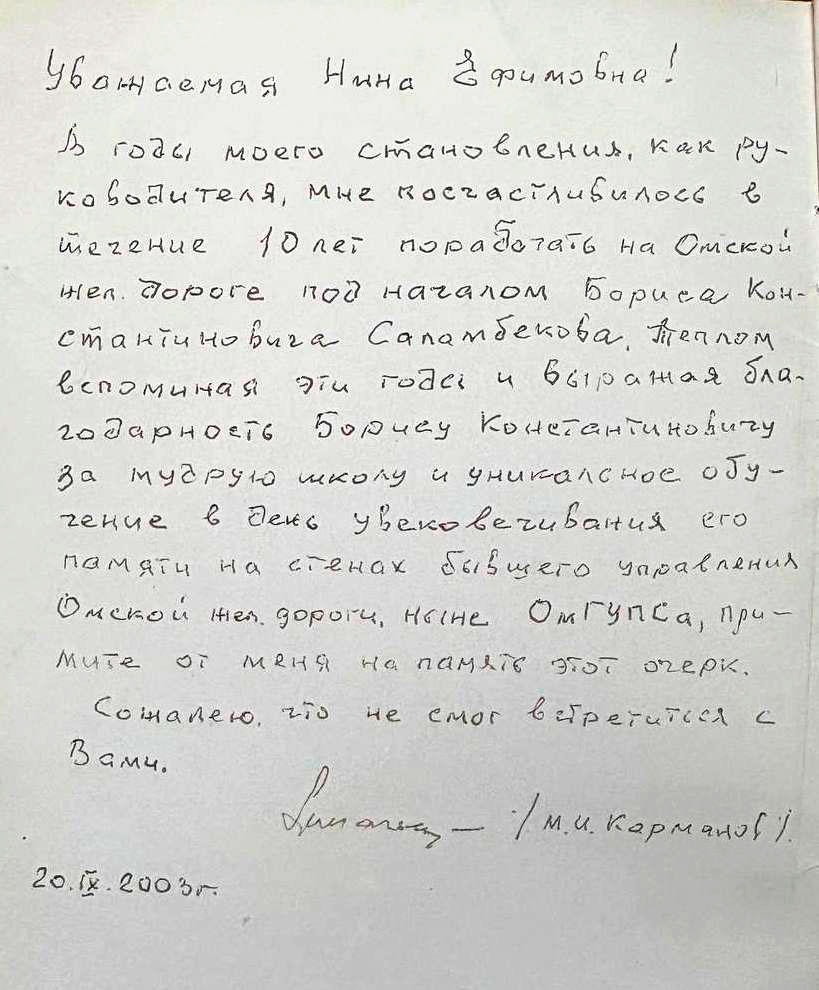 Борис Константинович Саламбеков быль руководителем, под чьим мудрым началом Михаил Иванович Карманов приобретал бесценный опыт, и память о котором сохраняется не только в официальных документах, но и в таких личных, эмоциональных свидетельствах, как эта дарственная надпись. Книга становится мостом, соединяющим две эпохи железнодорожного дела, два поколения специалистов, чей профессиональный путь был тесно переплетен.