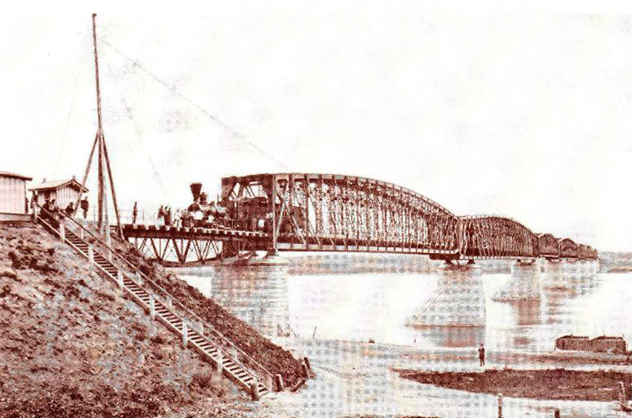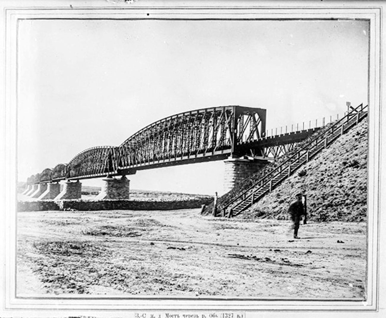 Строительство Великого Сибирского пути разделили на шесть основных участков. Первый участок линии – Западно-Сибирская железная дорога, начинался от Челябинска и заканчивался мостом через реку Обь. Согласно «Отчету по постройке Западно-Сибирской железной дороги», составленному в 1896 году, на этом участке было сооружено: 274 искусственных сооружения, из них 7 чугунных труб и 2 каменных, 261 деревянный мост и 4 больших моста с металлическим верхним строением на каменных опорах. Это были переправы: через реку Тобол отверстием 200 саженей (426 м), через реку Ишим отверстием 100 саженей (213 м), через реку Иртыш отверстием 300 саженей (639 м). Заканчивалось сооружение линии самым большим мостом через реку Обь отверстием 372 сажени (793 м). Согласно отчету «стоимость больших мостов с каменными опорами на кессонных основаниях и железным верхним строением на погонную сажень составила 7411 руб. 35 копеек».