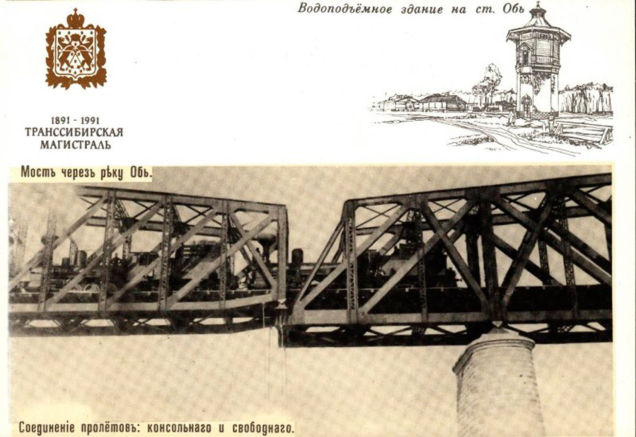 4.Водонапорная башня на ст. Обь. Мост через реку Обь. Открытка из комплекта «Транссибирская магистраль. 1891-1991 гг.»