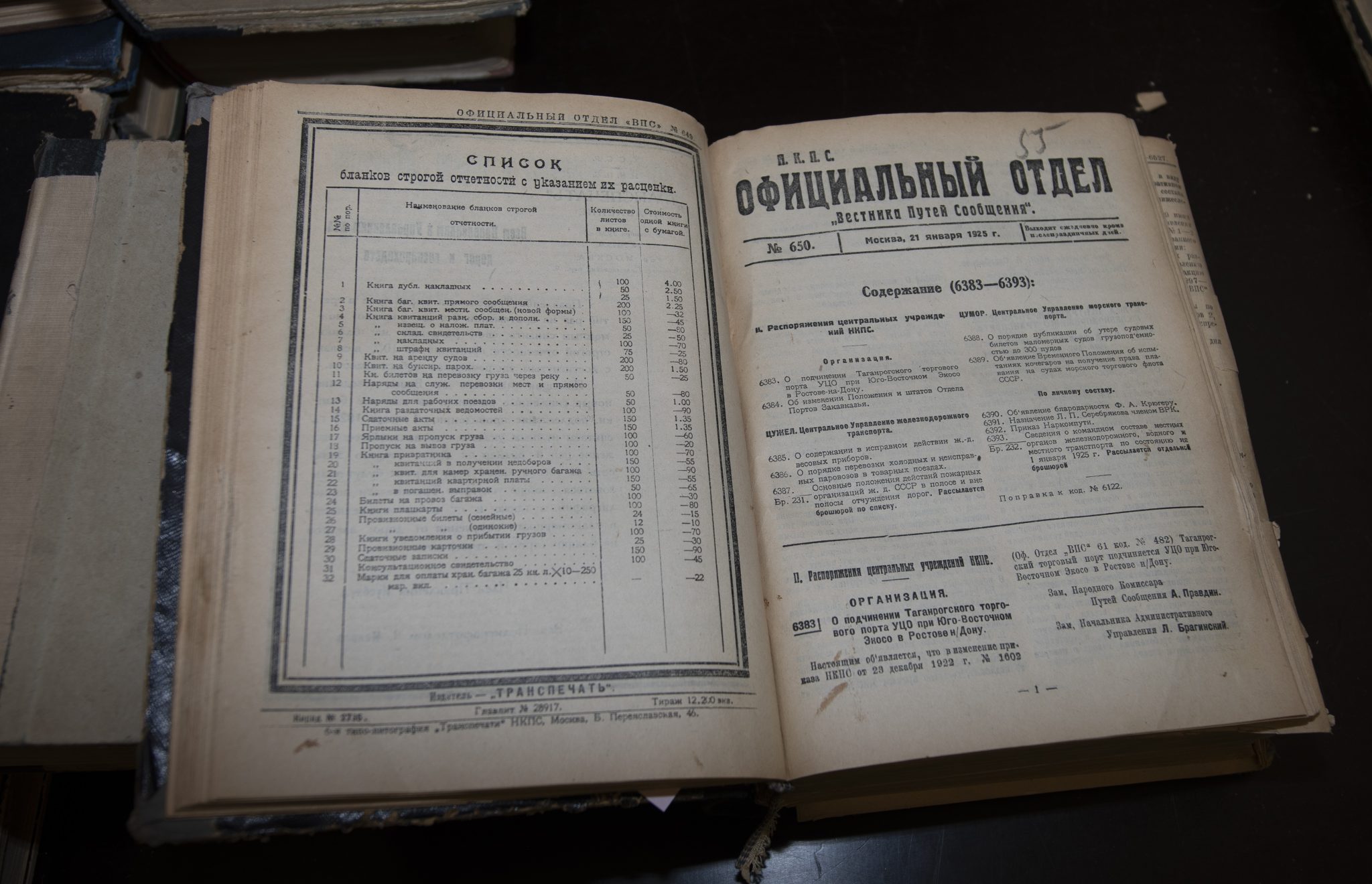 Пухлые старые книги – это 90 подшивок официальных документов Народного комиссариата путей сообщения (1920–1946 гг.) и Министерства путей сообщения (с 1946 г.), охватывающих 30 лет советской железнодорожной истории. Материалы фиксируют эволюцию управления железными дорогами: от восстановления после Гражданской войны до индустриализации, Великой Отечественной войны и послевоенного восстановления. Это собрание обладает документальной ценностью для исследований железнодорожной инфраструктуры, кадров и транспортной политики СССР.
