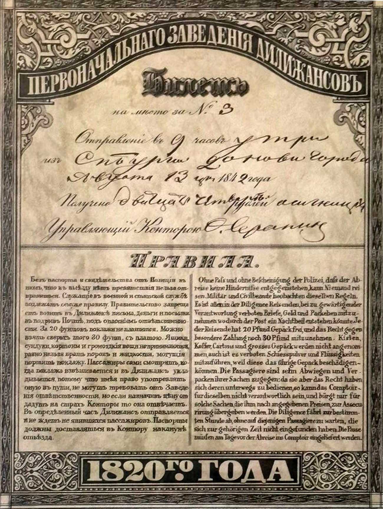 Организацией поездки в тот период, начиная с 1820 года, занималось «Общество первоначального заведения дилижансов». Поездка по билету, представленному в музее, состоялась из Санкт-Петербурга в столицу 13 августа 1843 года. Место №3 было не самым дорогим. Обходилось оно, также, как и место №4, в 55 рублей. Более комфортные места №1 и №2 стоили 95 рублей. В верхней части билета указаны время отправления — 9 часов утра, дата, «управляющий конторой» и его подпись.