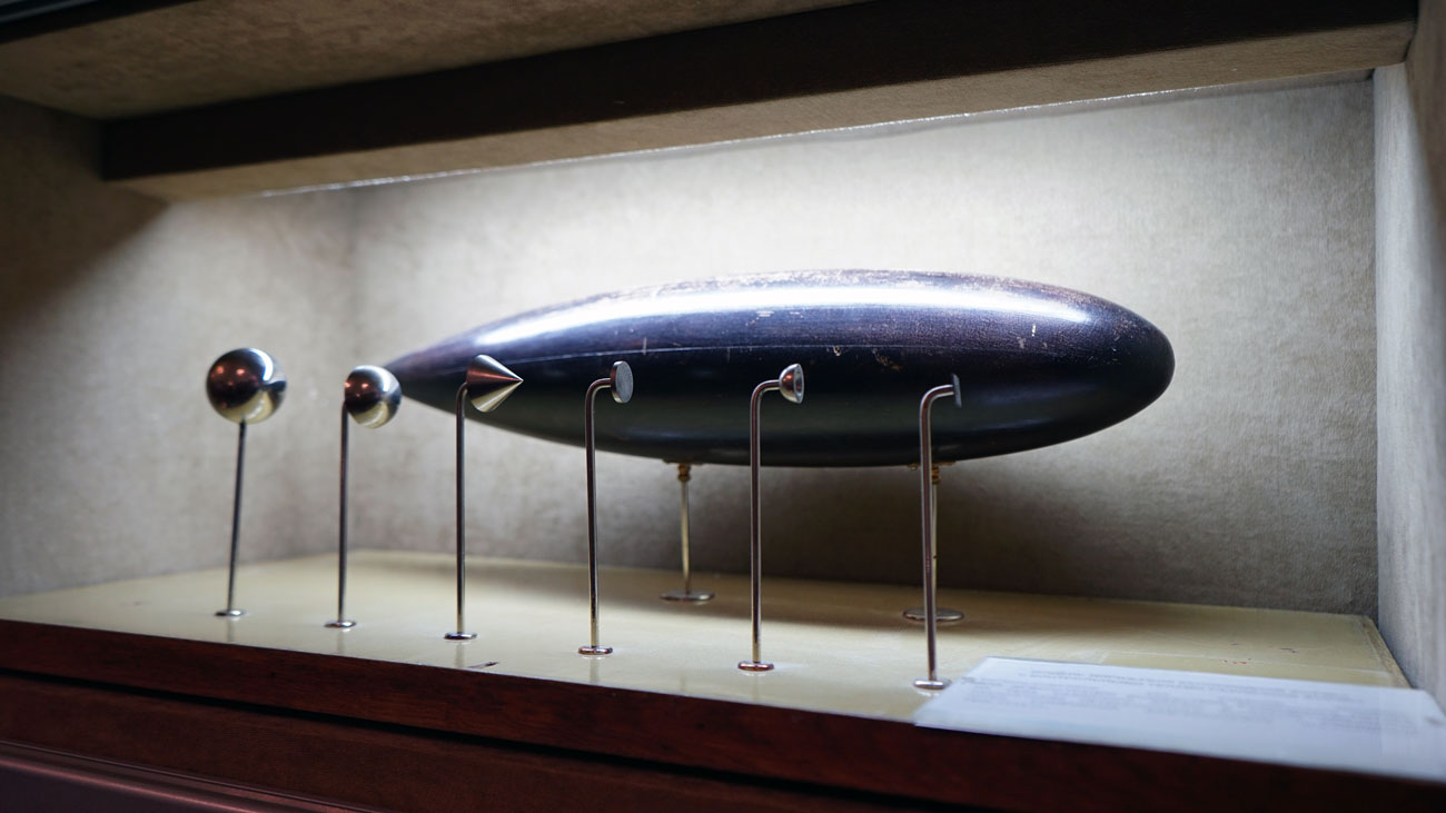 «В данной витрине размещены научно-исследовательские труды в области аэродинамики подвижного состава. Кафедра «Вагоны и вагонное хозяйство» ЛИИЖТА и доцент кафедры, кандидат технических наук Николай Александрович Чурков проводили исследования по теме «Аэродинамика высокоскоростных поездов». Здесь на стенде представлены модели головных частей, которые продувались в аэродинамической трубе Ленинградского политехнического института (ЛПИ им. Калинина). Модели представляют собой формы головных частей скоростных поездов. Испытания проводились в старейшей аэродинамической лаборатории ЛПИ (Ленинградский политехнический институт им. Калинина). В витрине вы можете видеть уникальные приборы: манометр для измерения давления воздушных потоков, прибор для измерения модуля скорости, термоанемометр постоянной температуры, система трубок для подачи в воздушного потока мелкодисперсной смеси (капелек), позволявшие визуализировать картины обтекания. Спустя пол века мы постарались воспроизвести это историческое событие. Учёные Политехнического университета Петра Великого по нашей просьбе осуществили реконструкцию испытаний. На выставке представлен видеоотчет о том, как это было», – рассказал куратор.
