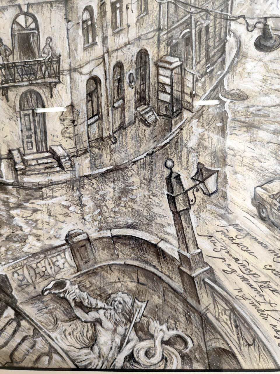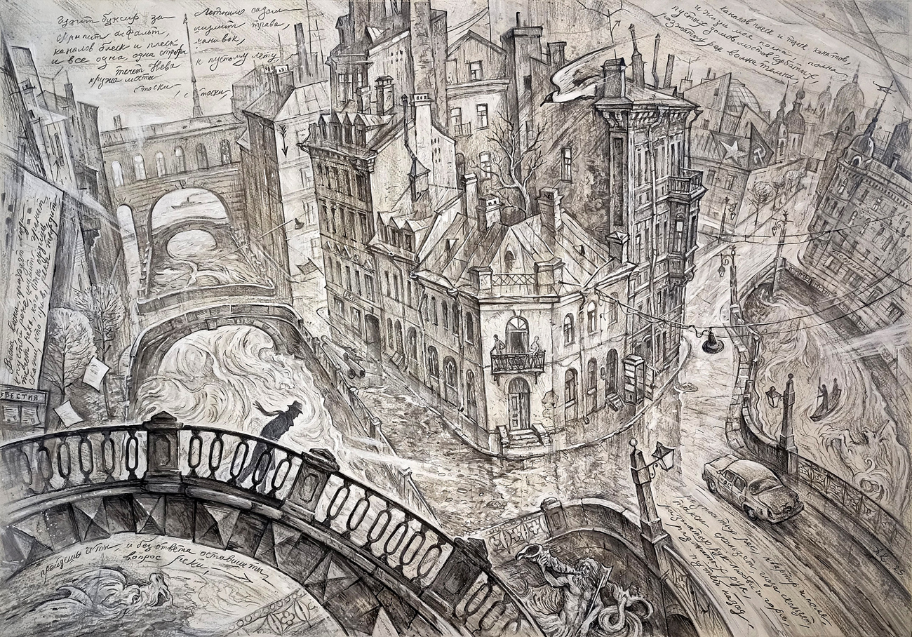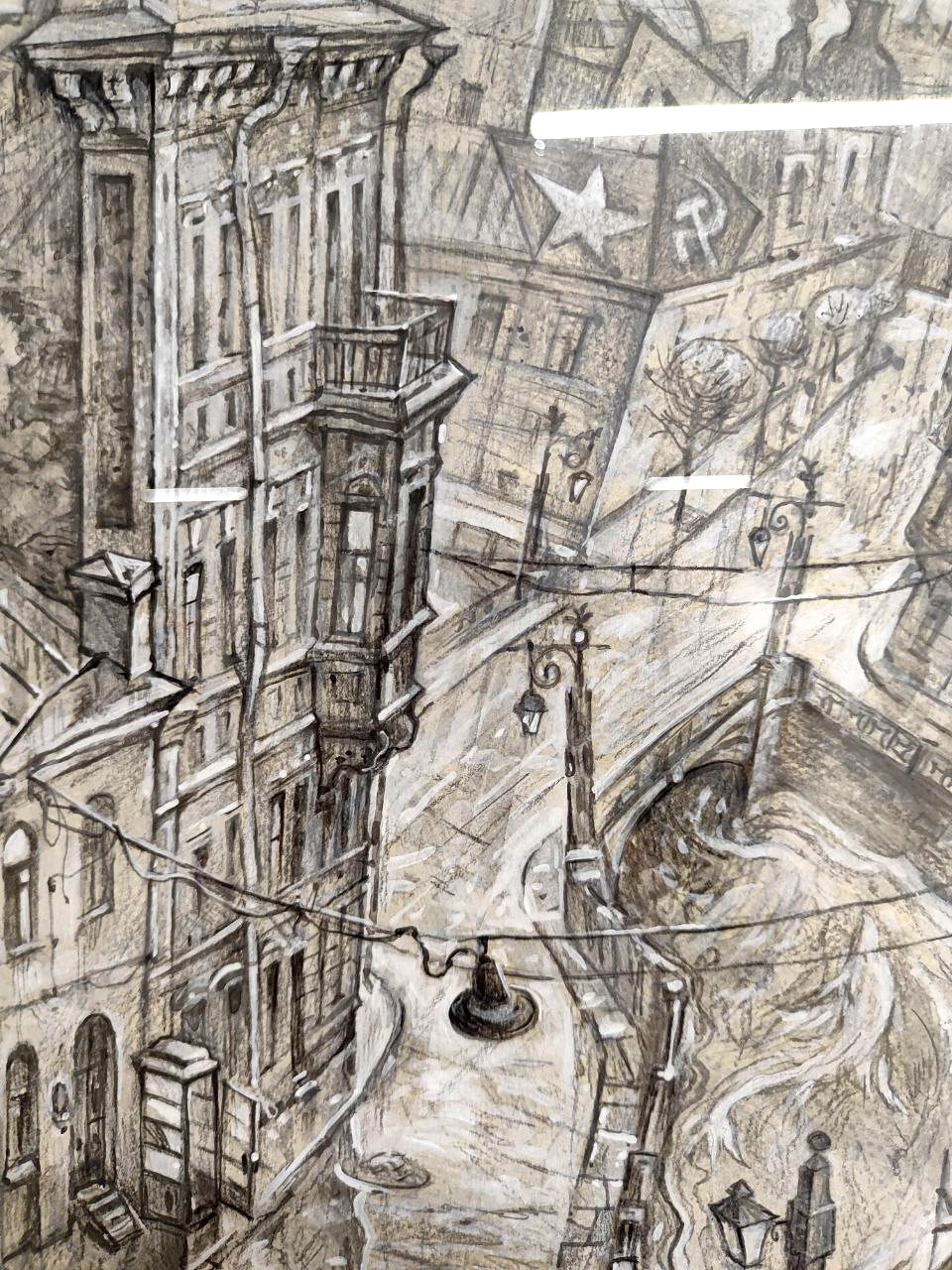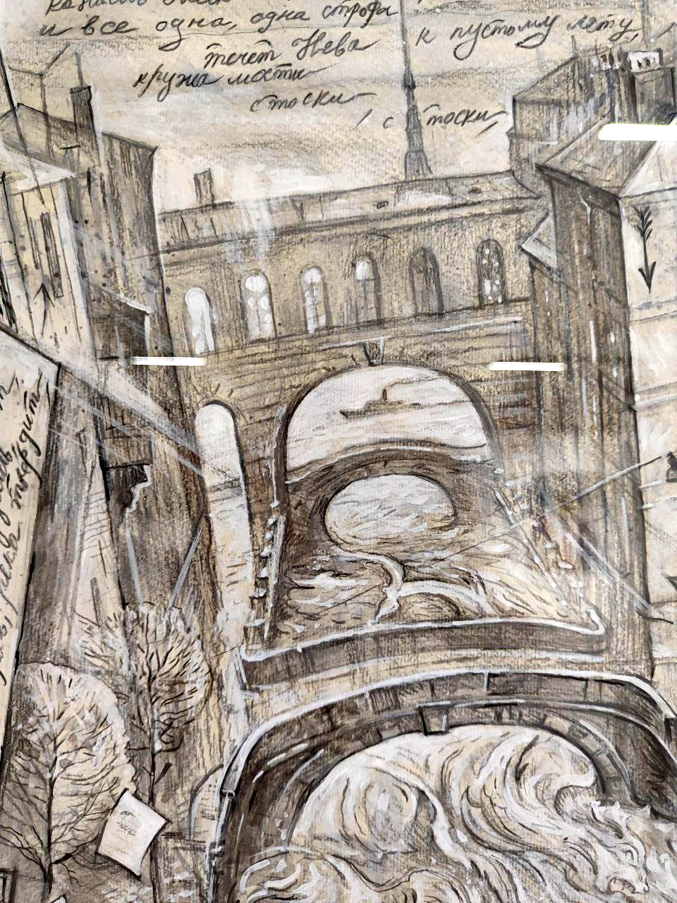 Сегодня мы расскажем о работе Кирилла Аланнэ «Мосты Бродского». Художник погружает зрителя в сон о загадочной прогулке по старому Петербургу вместе с поэтом. В произведении художник создает единое полотно повествования, объединяя мосты города в сплошном пространстве городского пейзажа. Благодаря тому, как К. Аланнэ сочетает в своем произведении разные точки обзора на памятники петербургской архитектуры, город как бы разворачивается перед зрителем в широкую историю, сопровождающуюся строчками из «Петербургского романа» И. Бродского: