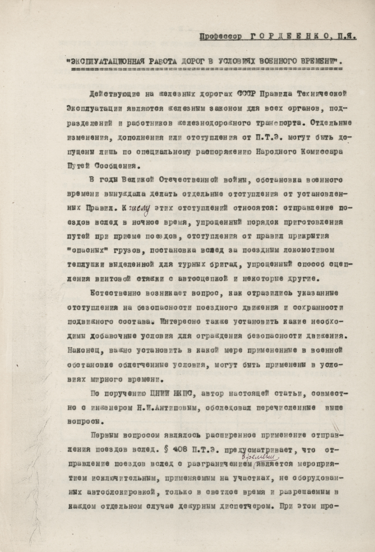 6. Рукопись. Гордеенко П.Я. Эксплуатационная работа дорог в условиях военного времени. ЦМЖТ КП-6228/14.